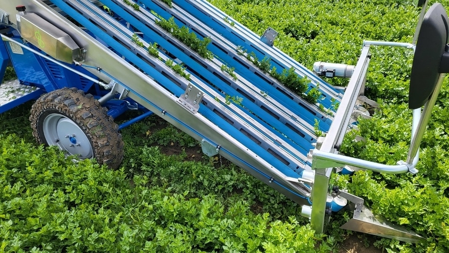 The new DARI electric harvester can now be equipped with a row harvester and solar panels. With the small conveyor belts, the herbs are transported upwards, so the worker can immediately make a bundle.